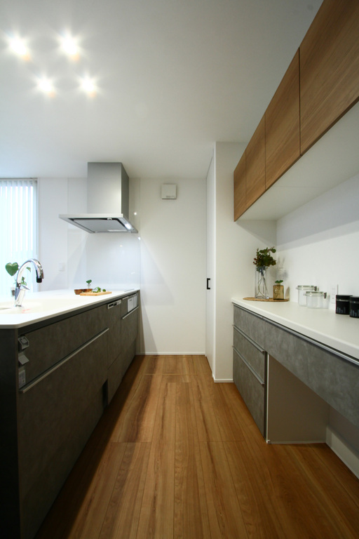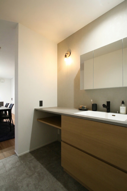 洗面室には、お施主様こだわりの造作洗面台を設置。アイカのスタイリッシュカウンターと深型のボウルを組み合わせたことで、つけ置き洗いなどの家事の利便性と意匠性を兼ね備えています。