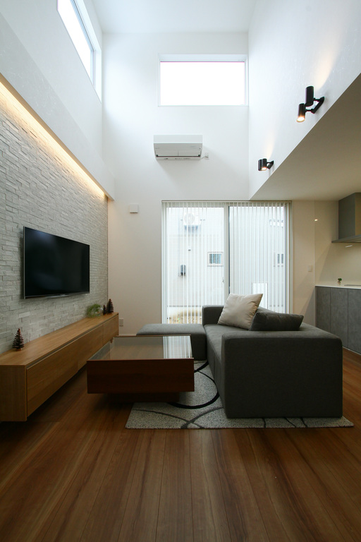 南側に配置した中庭と、リビングの大きな吹き抜けが一日中柔らかな光を室内へ運びます。