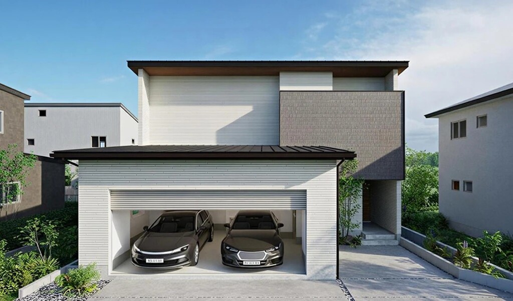 機能美を追求したガレージと植栽が彩る佇まい