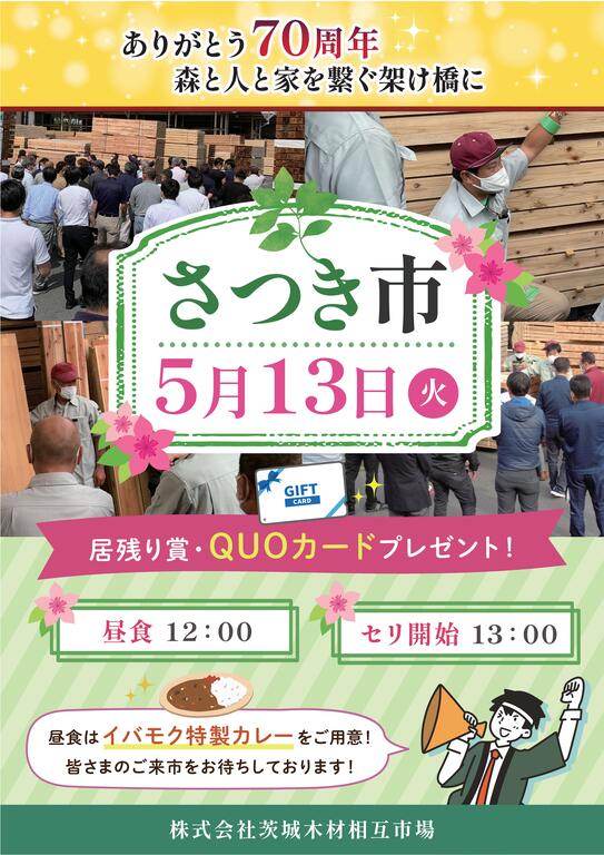 | タイトル | 【茨城木材相互市場】さつき市(※当社と約定をかわしたお取り先様のみのイベントになります) |