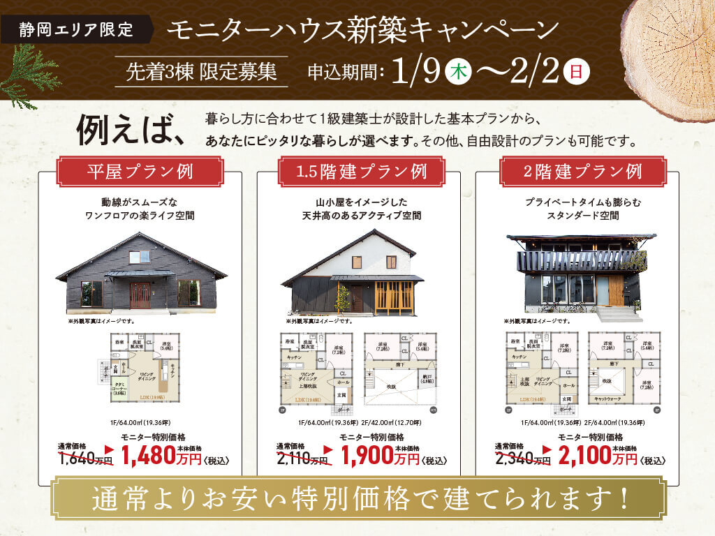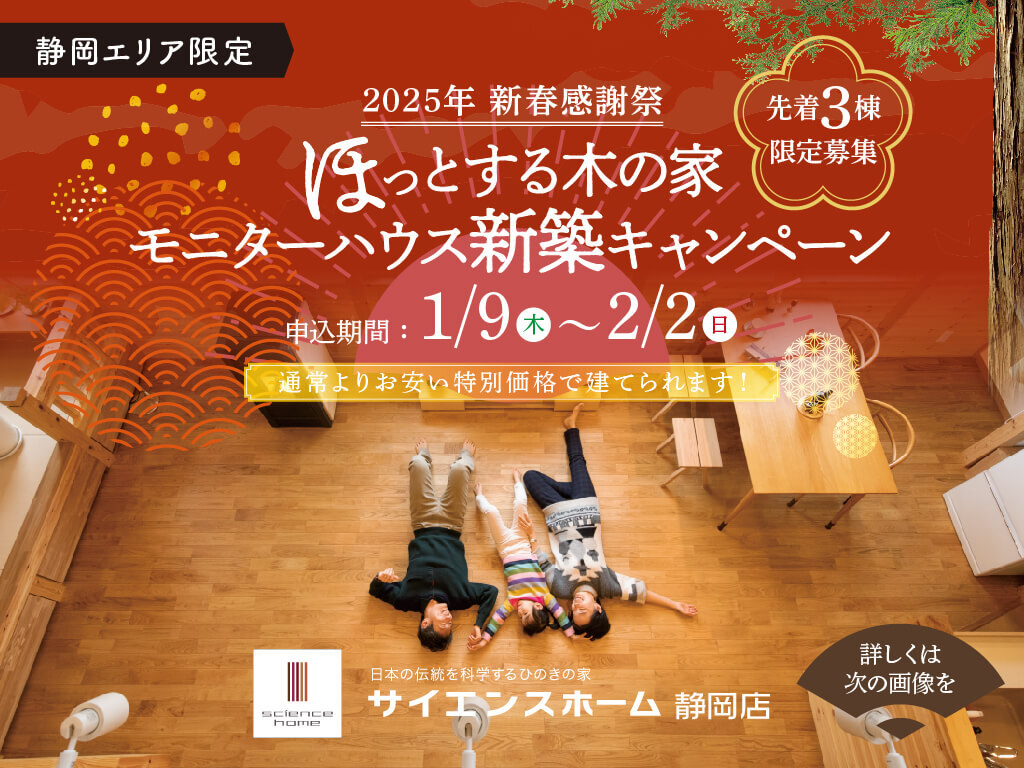 サイエンスホーム静岡店では、1月9日(木)~2月2日(日)まで、条件を満たした方に特別価格で新築住宅をご提供するモニターハウスキャンペーンを開催いたします!