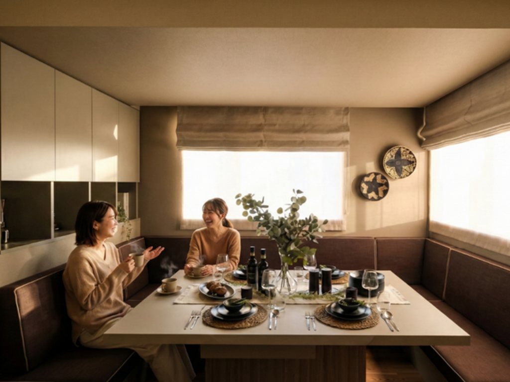 おもてなしがもっと自由に、気兼ねなく。大きなダイニングテーブルを、3方向からベンチソファで囲む配置スタイル。 ファミレスのボックス席のように、みんなが向き合って座れる、親密で居心地の良い空間。