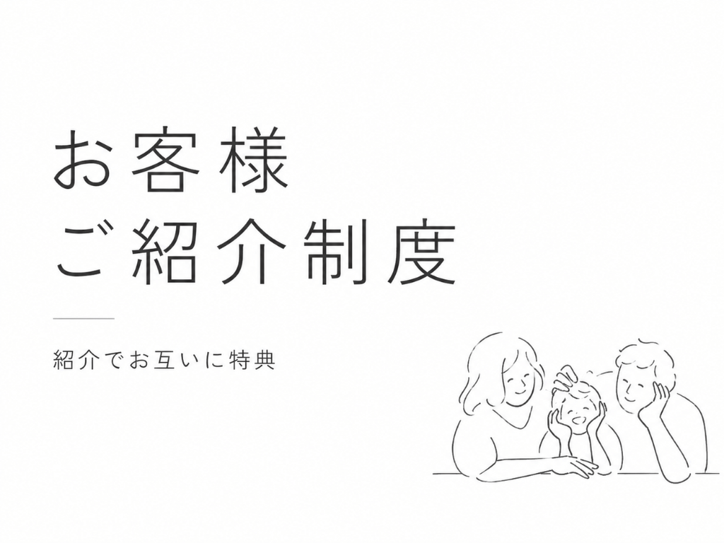弊社では、新築・リフォームを問わず、ご紹介くださる方も、ご紹介を受けられる方も、どちらも嬉しい「お客様ご紹介制度」をご用意しております。
