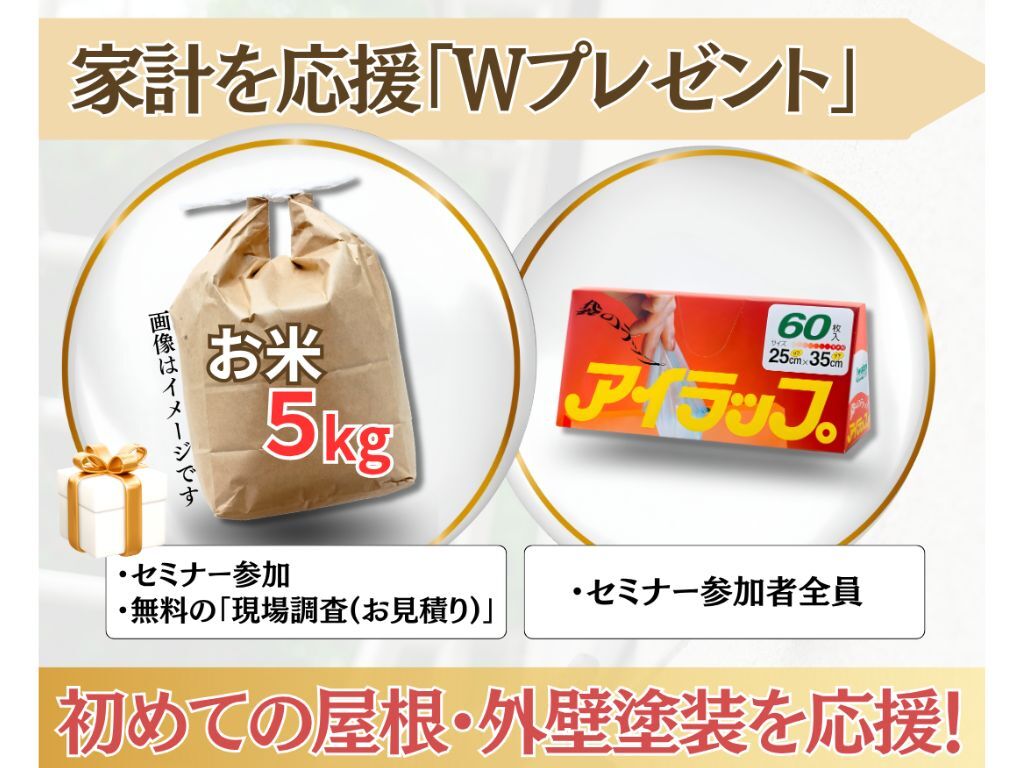 最近の物価高や値上げのニュースばかりで、毎日のやりくりも本当に大変ですよね。 そこで今回のセミナーでは、大切なお家のメンテナンスを真剣に考える皆様の家計を「少しでも応援したい!」という思いから、毎日の暮らしに直結する実用的なプレゼントをご用意しました✨