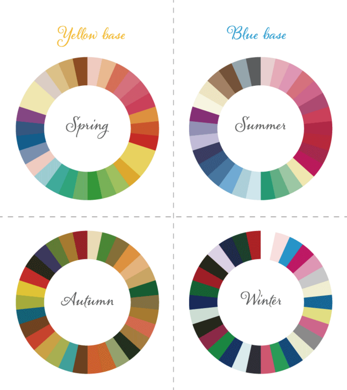 4つの色のグループに「春」「夏」「秋」「冬」というニックネームをつけて、もっとも似合う色のグループがどのシーズンか診断するスタイルが広く知られています。