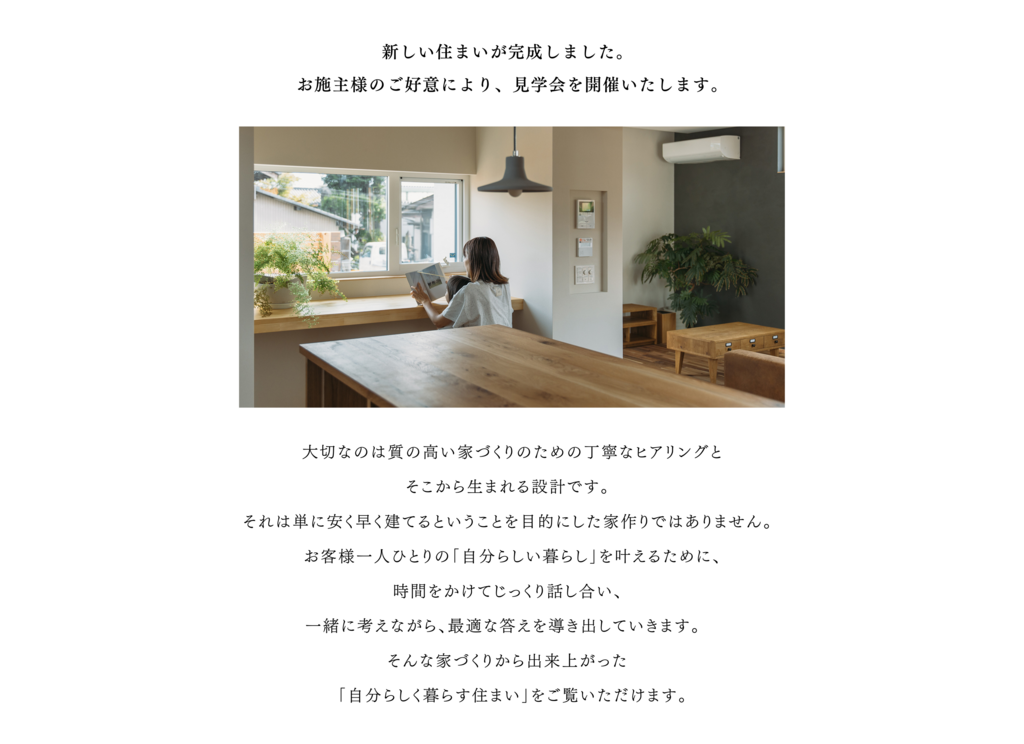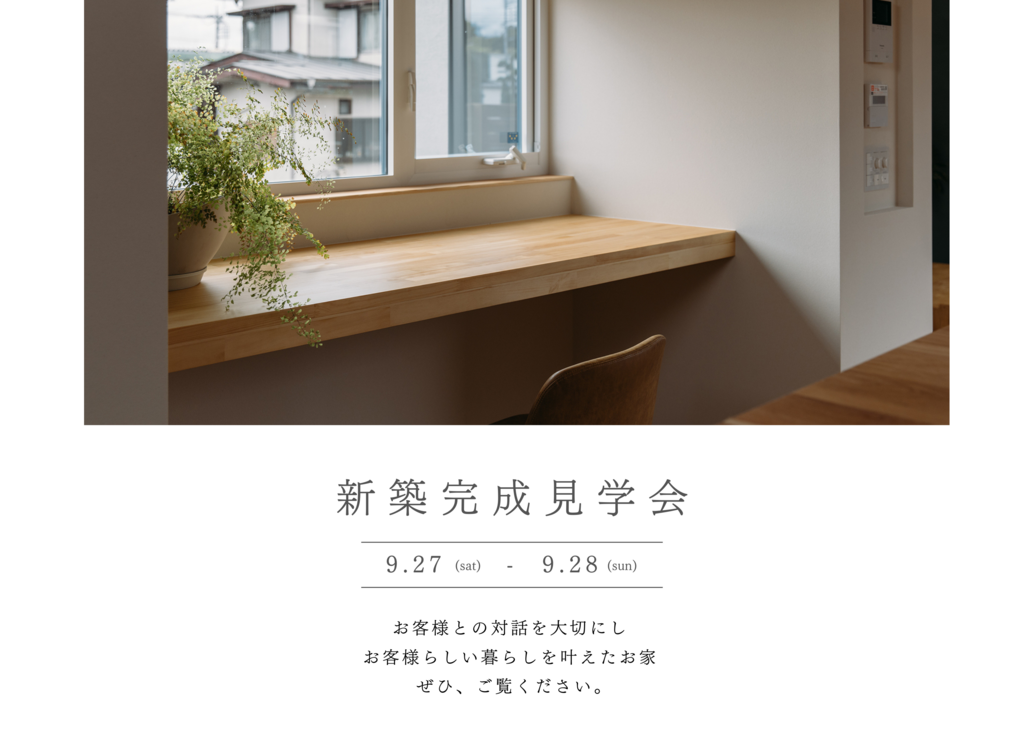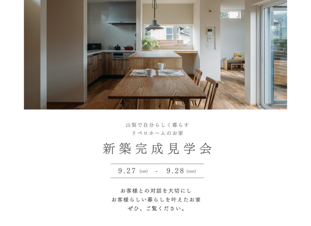| タイトル | 新築完成見学会【山梨で自分らしく暮らす、リベロホームのお家】9/27(土)〜9/28(日)開催! |