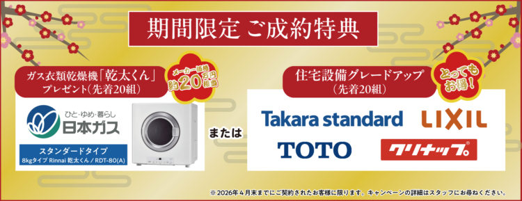 新築応援キャンペーンとして、各住宅設備メーカーによるご成約特典をお贈りいたします!ガス衣類乾燥機乾太くんの進呈や標準仕様から無償グレードアップなど、お得が盛り沢山です。この機会にぜひ、家づくりを考えてみませんか?