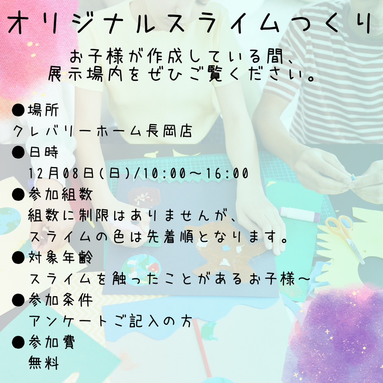 クレバリーホーム新潟では、お子様と一緒に楽しめる「オリジナルスライム作りワークショップ」を開催します。
