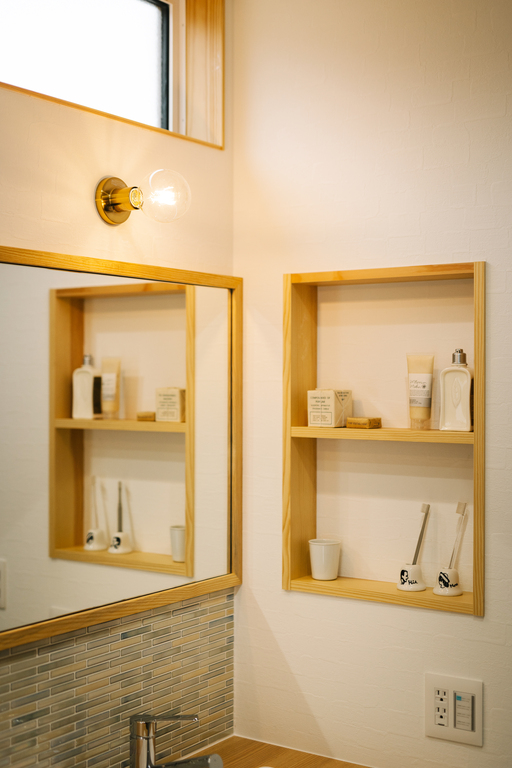 紅葉を楽しめる庭、洗い出し仕上げの玄関土間や床材に地松を採用したりと和の心を感じる空間づくりとなっています。