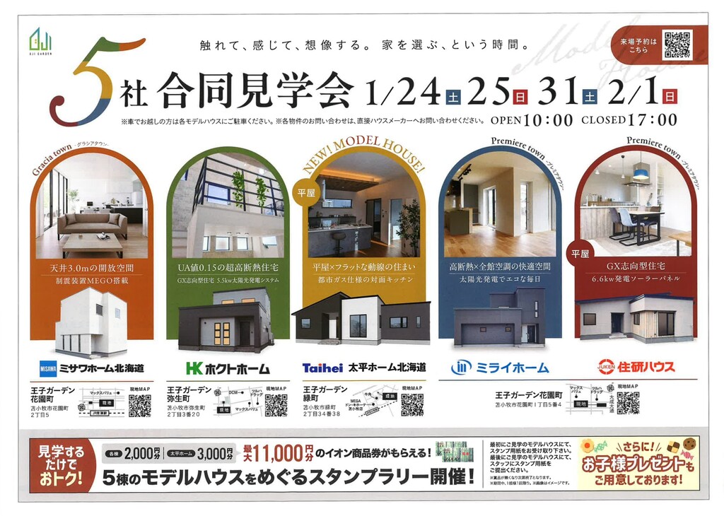 5棟のモデルハウスを見学しながら、住まいの違いを見比べできる合同見学会を開催します。