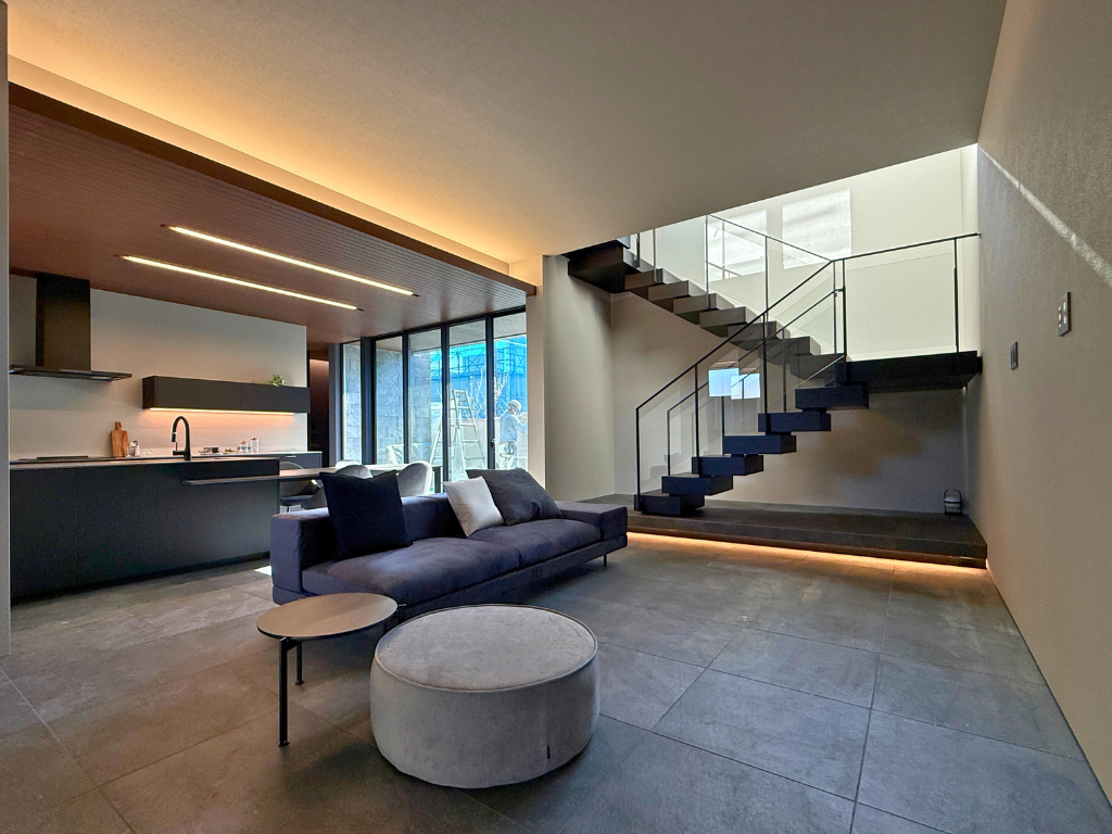 高天井とハイサイドライトが、光と開放感を最大限に引き出すスタイリッシュな空間で、上質な寛ぎを。