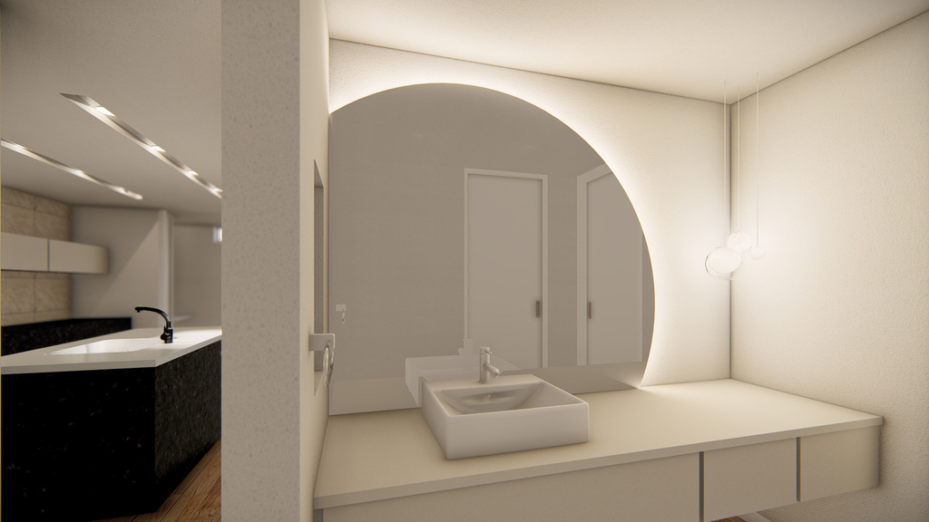ノイズ削減として要所で間接照明を取り入れ、ダウンライトも乱立させずニッチ等を多用しまとめました。