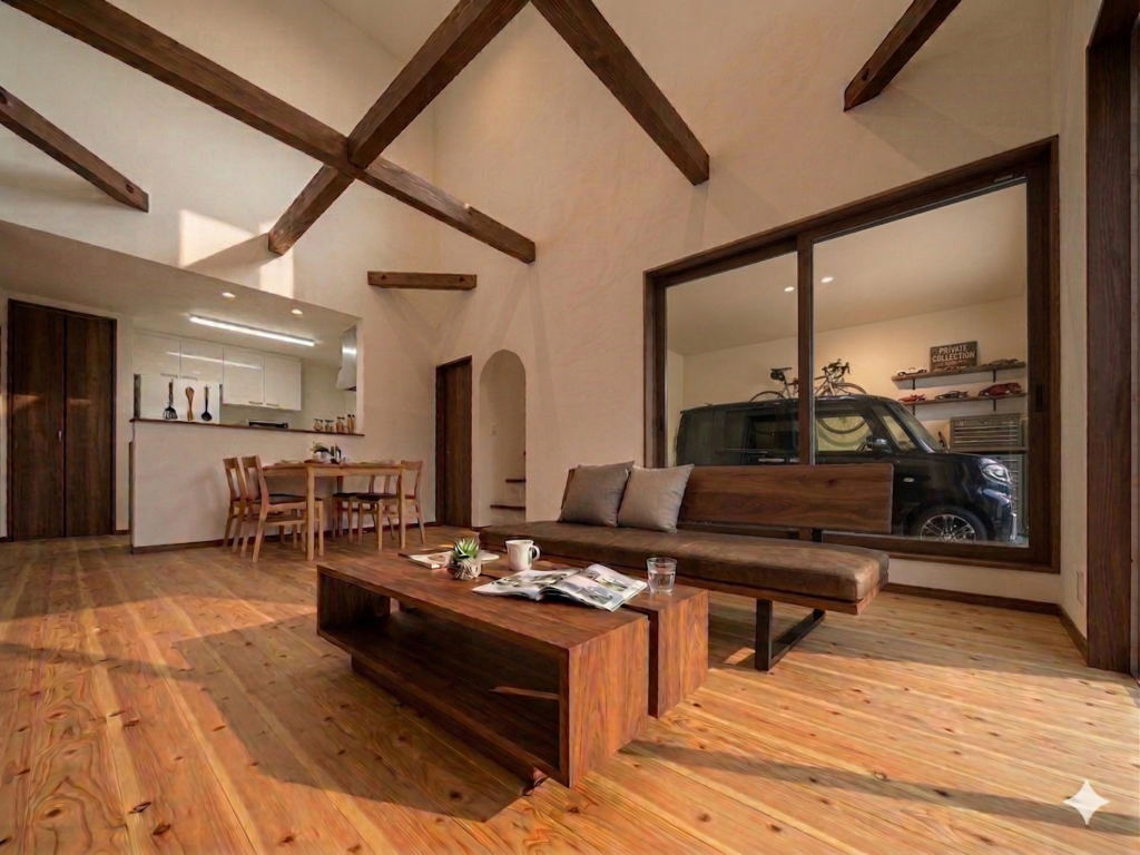 自然素材に包まれる開放的な大空間。家族を優しく見守る遊び心満載のスキップフロアに、空間を無駄なく活かした実用的なインナーガレージ。圧倒的なデザインと毎日の快適な暮らしが両立する、理想の住まいです。
