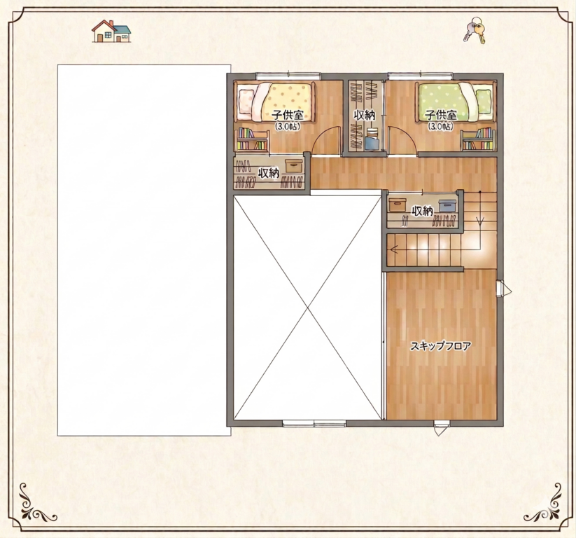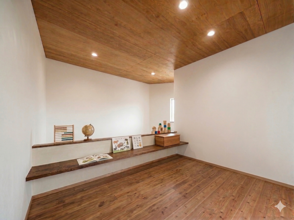 リビングを見渡せるように配置されたスキップフロアは、家事の合間でもお子様の勉強する姿を優しく見守れる安心のスタディスペース。視界が開けた開放感と、頭上に広がる勾配天井のダイナミックな造りが、まるで秘密基地のようなワクワクする空間を創り出します。家族の繋がりと遊び心を両立した理想の住まいです。