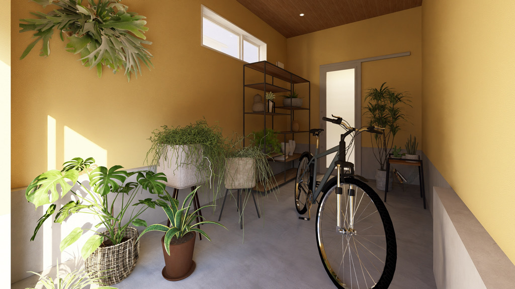 一階のスペースにバイクガレージ&ガーデニングスペースを設置、都会の癒しがここに