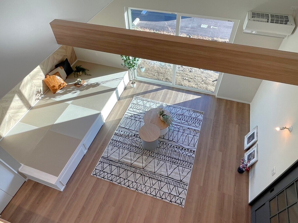 ナチュラルモダンを意識したこのモデルハウスのリビングは、勾配天井から射し込む自然光が心地よい明るさと開放感を演出し、心を癒すナチュラルな雰囲気を作り出します。リビング一角の小上がり和室はゆったりしたひとときを過ごせます。家族での団らんや、リラックスしたいときにも最適で、心地よい時間を約束します。ぜひ、体感してください。