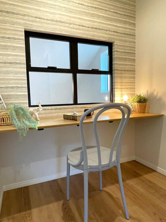 室内窓からは1階リビングが見渡せ、ここでも家族との繋がりが感じられます。