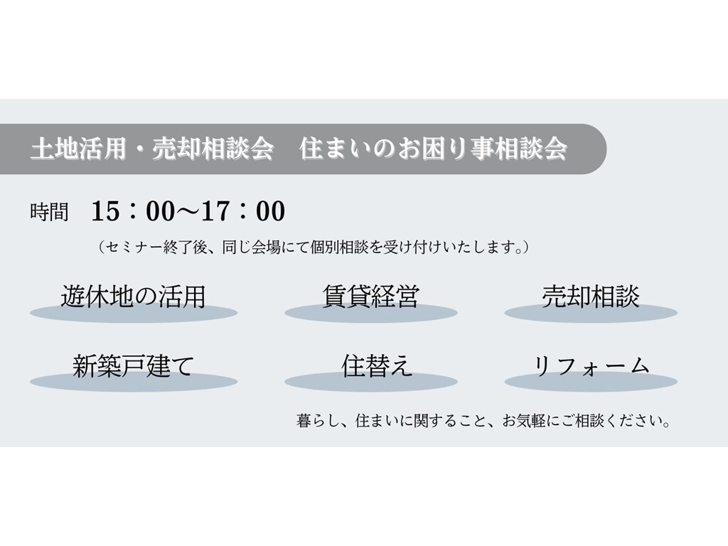 ※15:00~17:00は土地活用・売却相談会、住まいのお困り事相談会を予定しております。