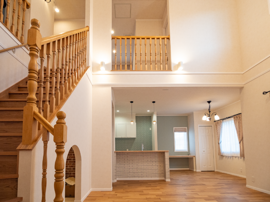 吹き抜けの上からは自然光が差し込み、お家の中でのびのび過ごすことができます