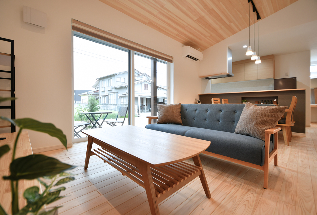 ●木のぬくもり溢れる癒しの空間。勾配天井が開放的なリビング