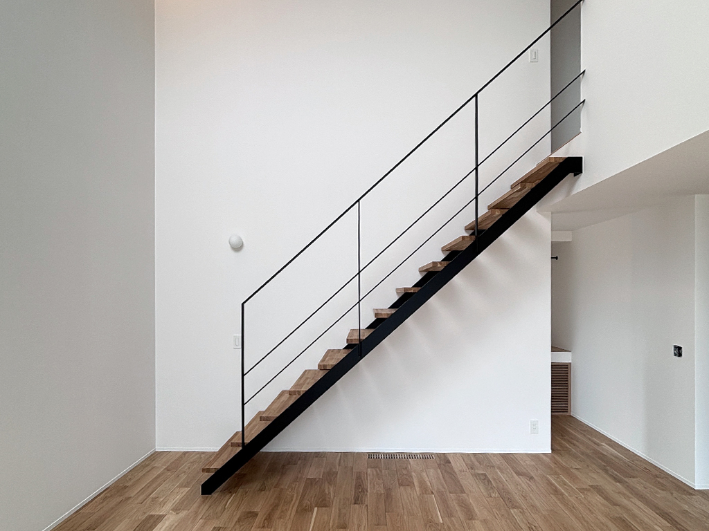 大開口の吹き抜けにアイアン製のオープン階段、敷地の利点を活かし、