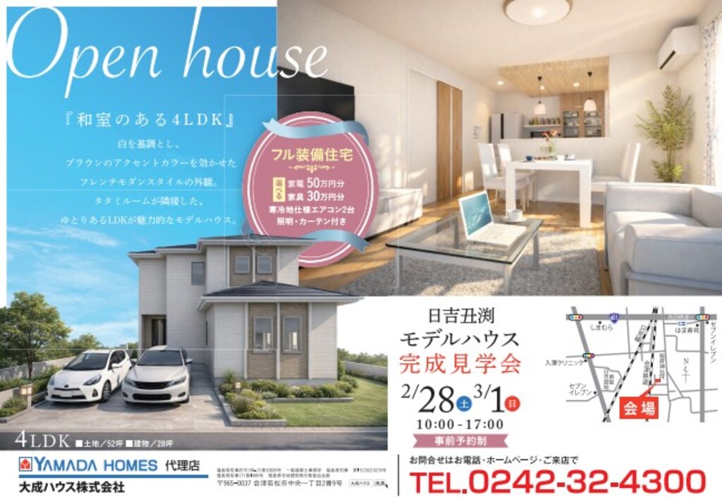 2/28(土)-3/1(日)の2日間、会津若松市門田町日吉丑渕にて新築モデルハウスの完成見学会を開催いたします!AM10:00-PM17:00 事前予約制での開催となります。