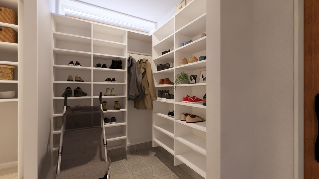 洗面所と脱衣所に加え、独立したランドリールームを確保。洗濯から室内干し、収納までが一か所で完結する効率的な動線設計です。忙しい共働き世帯にも嬉しい、家事負担を軽減する間取りとなっています。