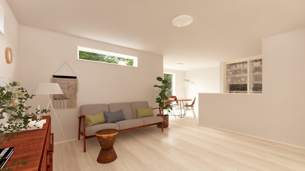約20帖の広々としたLDKは、家族が思い思いに過ごせる開放的な空間。ホールやパントリーとの間に見切りを設けない設計で、より一体感のある伸びやかな広がりを実現しています。大きな窓から光が差し込み、明るく心地よい団らんの時間を演出します。