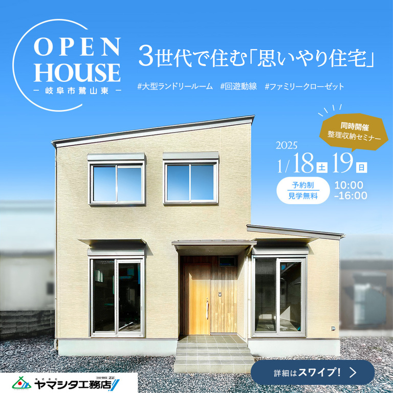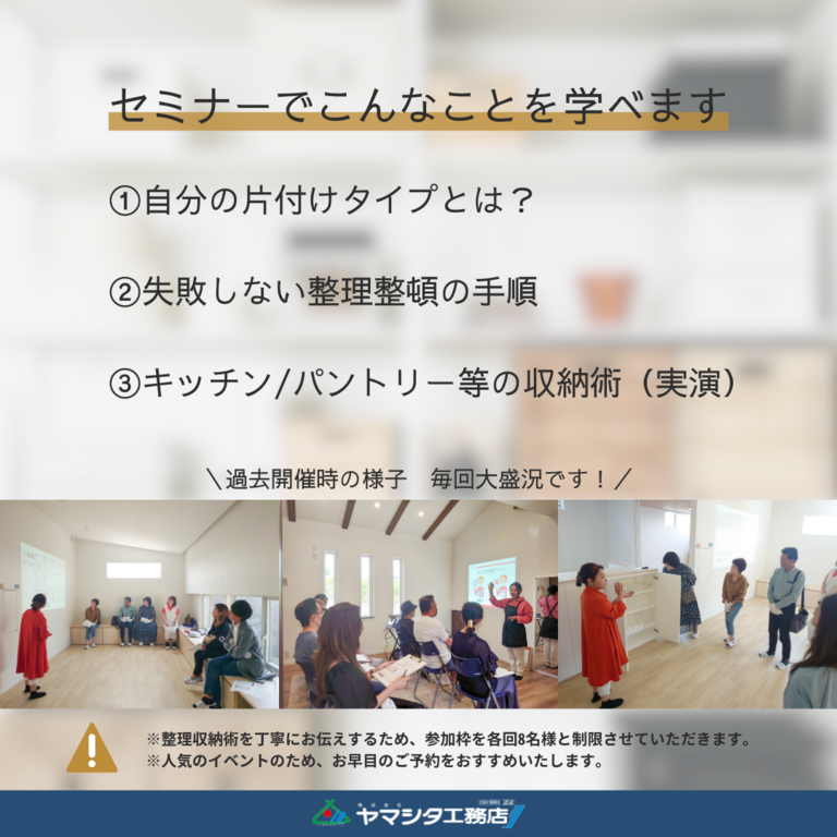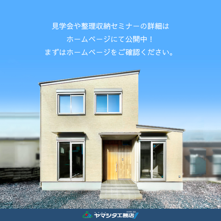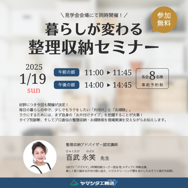 また、同時開催の収納セミナーは予約制で行いますので、専用の予約フォーム(1/19(日)【暮らしが変わる整理収納セミナー】見学会会場にて同時開催 | 株式会社ヤマシタ工務店 郡上八幡本店)から申し込みをお願いします。