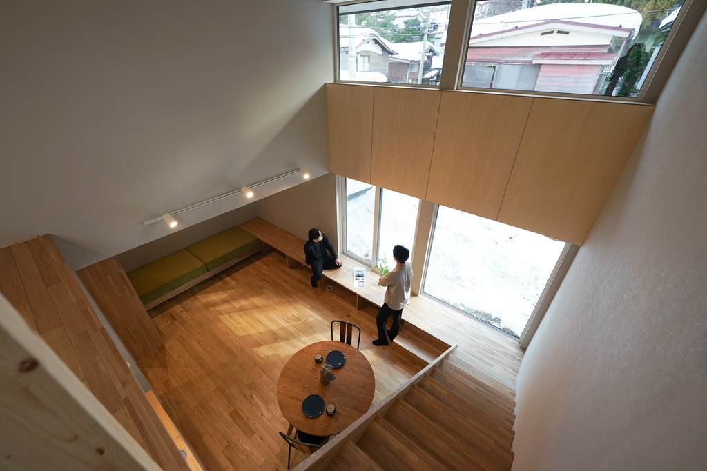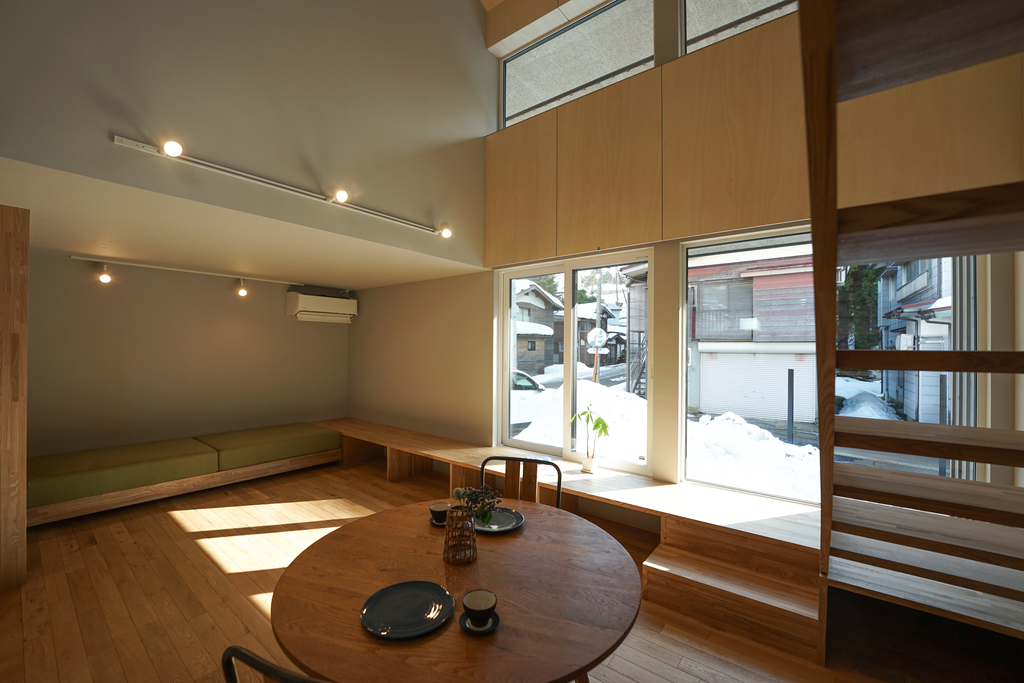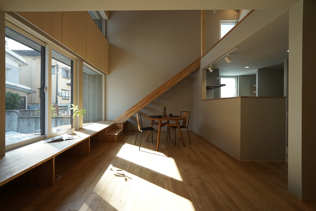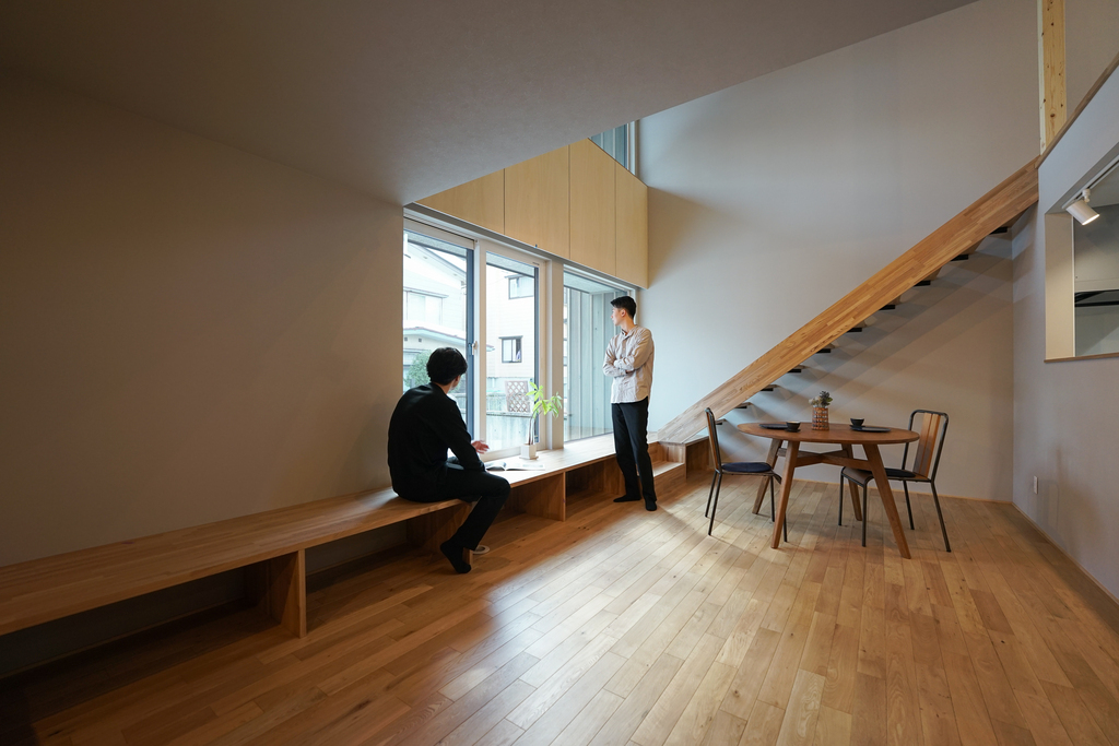 窓際には段板を重ねたベンチを設け、内と外をゆるやかにつなぐ心地よい居場所に。